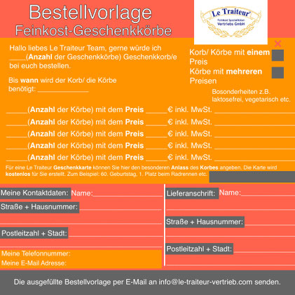 3. die ausgefüllte Vorlage per E-Mail an                info@le-traiteur-vertrieb.com senden